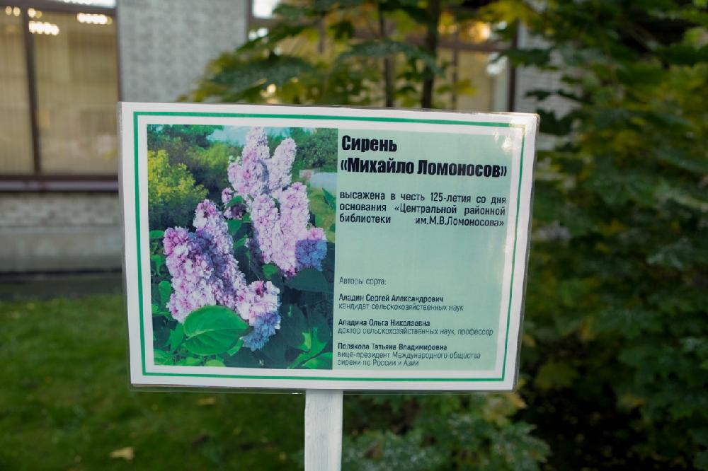В этом году Центральная районная библиотека имени М. В. Ломоносова Василеостровского района отмечает своё 125-летие. В честь юбилея у входа в библиотеку был высажен куст сирени сорта «Михайло Ломоносов» — подарок от творческой селекционной группы «Русская сирень».